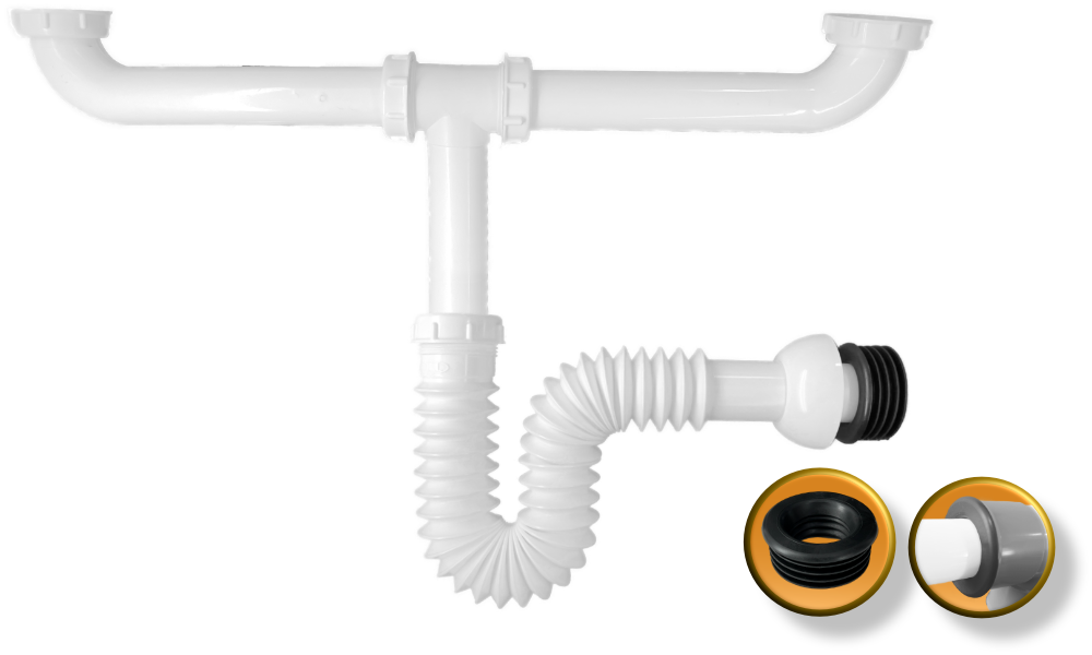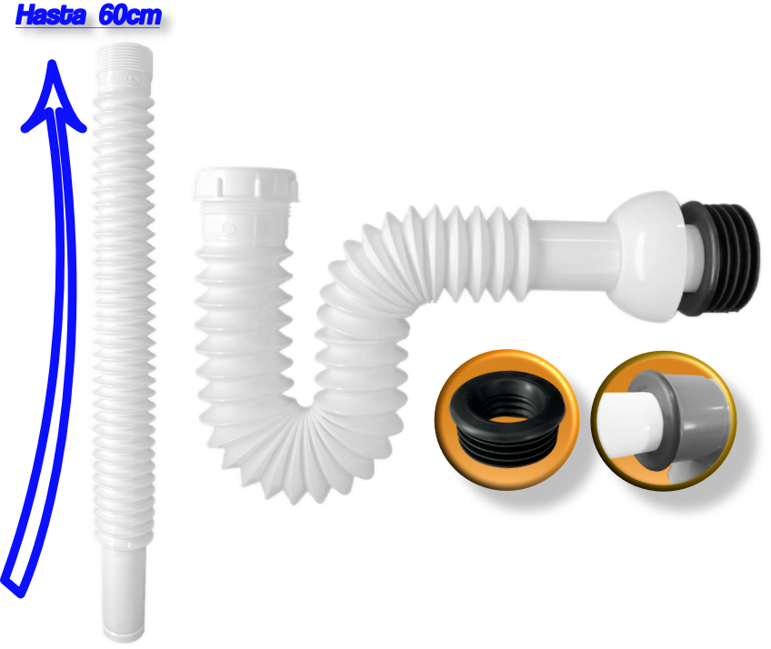 Trampa corrugada con adaptadores compatibles con lavaderos de cocina y lavabos de baño.