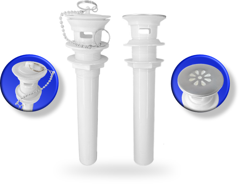 Trampa tipo “P” que incluye desagüe 1 1/4” con tapón blanco para lavabo de baño.